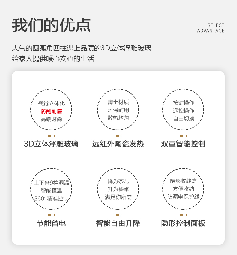 1、遠紅外陶瓷發(fā)熱,無明光明火。2、桌面采用3D立體浮雕玻璃,具有防刮耐磨、耐高溫等特點;3、功能升級,智能控制,遙控+按鍵雙重操控,高度隨心而定,使用時更方便。4、163度大圓弧管腳,大氣豪華,完美體現(xiàn)出現(xiàn)代工藝;